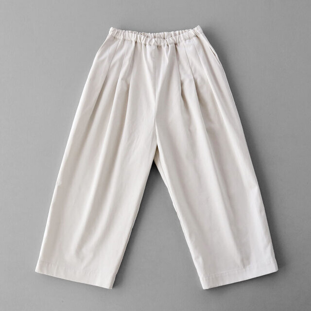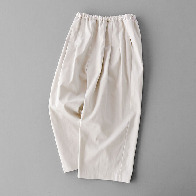 総丈はくるぶしが見え隠れするくらいの91cm丈。前面に左右3つずつタックを施し、外側の一本だけを内向きにすることで裾に向かってゆるやかに細くなる絶妙なコクーンシルエットが作られます。美しいシルエットですっきりとしたルックスでありつつも、股上が深めで穿き心地はゆったりとしているのも人気の理由。ウエストはうれしい総ゴム仕様で、内側のドローコードでサイズ調節も可能です。ポケットは両サイドに1つずつとバックにもフラップポケットが1つ配置されています。