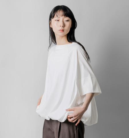 COGTHEBIGSMOKE(コグザビッグスモーク)より、ハイゲージコットン 5分袖 Tシャツ LILLYANA PUFFY SHORT SLEEVE TOPのご紹介です。オーバーサイズのハーフスリーブストップス。やや短めの身頃に二重仕立ての袖と、ふんわりと広がる裾が特徴です。裾リブは内側に折り込まれ、ストッパーでシルエットの調整が可能です。柔らかなフォルムと構造的なディテールが組み合わさった、ユニークな存在感の一着です。
