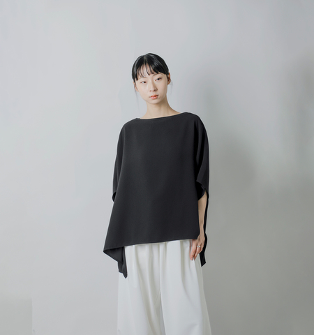 ボートネックのシャープなネックラインと、ゆったりとしたシルエットが印象的。脇にスリットが入り、前後差のあるヘムが軽やかな動きを加えています。シンプルながらも存在感のある一枚です。