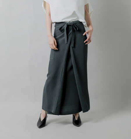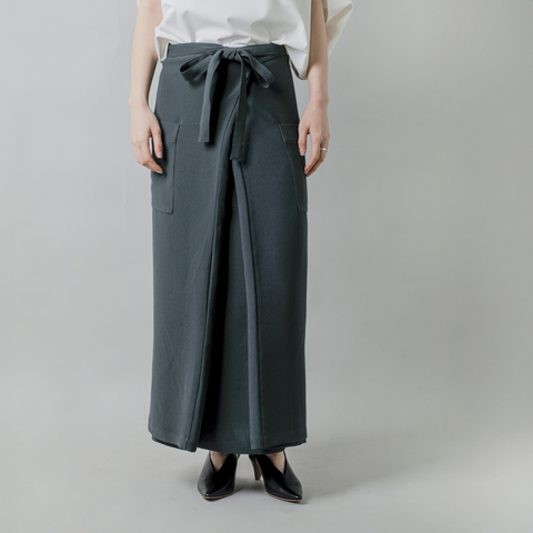 このスカートの特徴は巻き方によって表情を変えられる点。ラップを重ねる側はプリーツスカート風に、重ねない側はすっきりしたペンシルスカート風のシルエットに。ミニマルな中に、着方によるニュアンスの違いを楽しめる一着です。