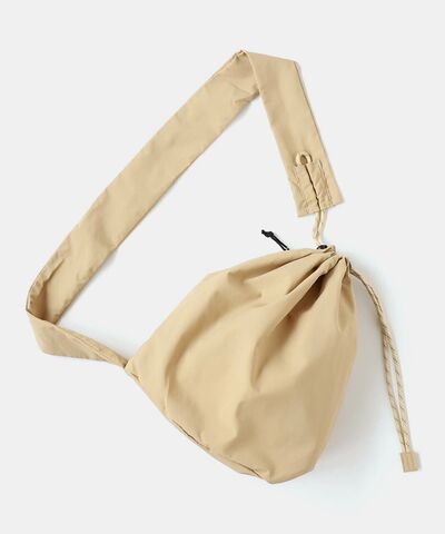 巾着タイプの袋状のバッグにショルダー紐がついた個性的なデザインのバッグです。