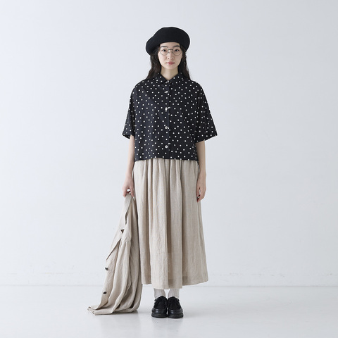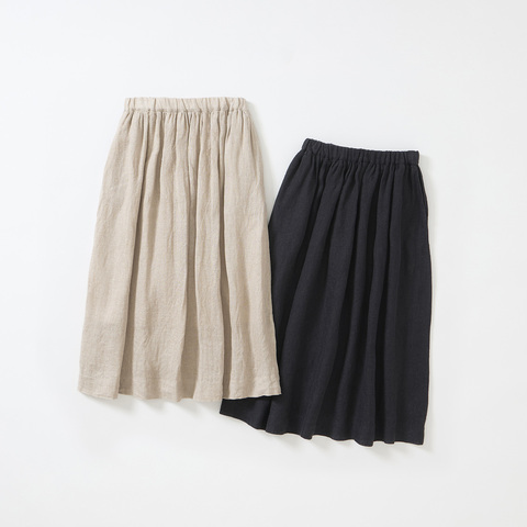 ワンウォッシュ・天日干し加工で風合いよく仕上げた、ざっくりとしたリネンガーゼ生地のギャザースカートです。