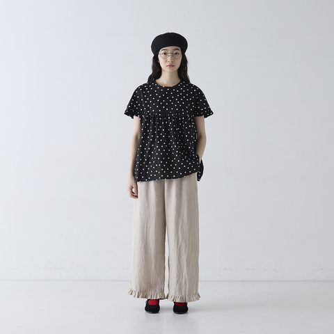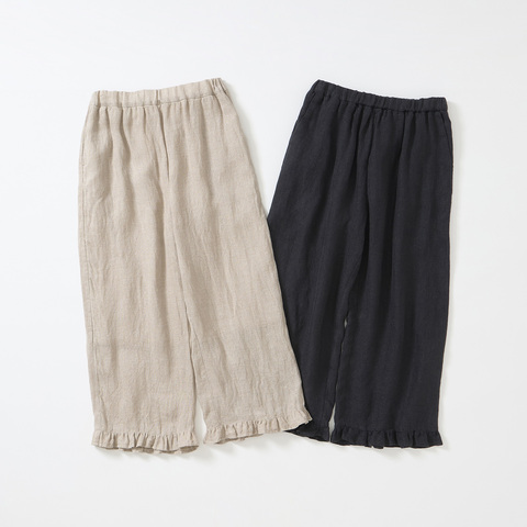 フェミニンに着こなす、リネン素材のフリルワイドパンツ