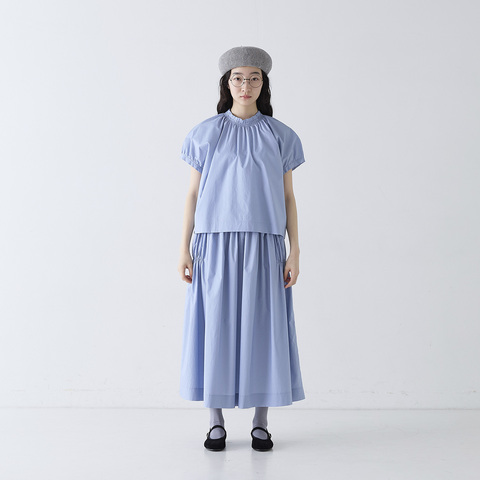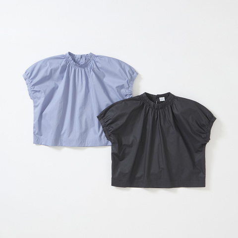 襟ぐりに施したシャーリングと、ふんわりとしたシルエットが女性らしさを引き立てる1枚です。