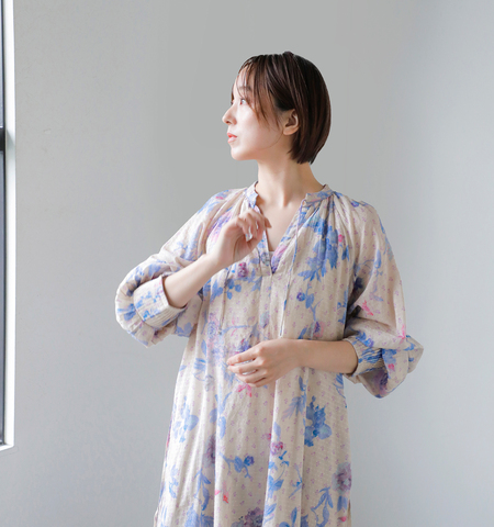 ne Quittez pas(ヌキテパ)より、ドットドビー ブーケ ウェービーウエスト ドレス Dot Dobby Bouquet Wavy Waist Dressをご紹介します。ドット柄を立体的に織り込んだドットドビー素材に、華やかなブーケ柄を重ねた表情豊かな一着。波打つようなウェービーウエストが自然なメリハリを生み、女性らしい美しいシルエットを演出します。コットン100%の軽やかな着心地と、インド製ならではの柔らかな風合いで、デイリーからお出かけまで活躍するドレスです。