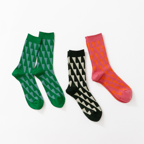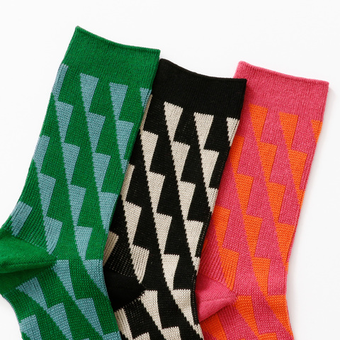 カジュアルスタイルに合わせたい、鮮やかなカラーが目を引く幾何学柄ソックス。