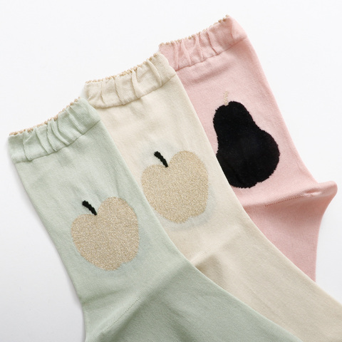りんごモチーフをゴールドのラメ糸で、洋梨モチーフをブラック糸で表現したソックスです。