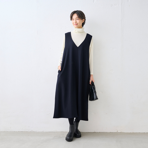 上質な圧縮ウールで仕立てた、大人に似合う、ジャンパースカート。ゆったりとしたシルエットと、深めのネックラインがポイントで、様々なインナーと合わせやすく、品よく着こなせる一枚です。裾に向かって広がるデザインで、動きやすく、ドレープが上品な印象。軽くて暖かい、圧縮ウールは心地よく、少しきちんとしたシーンにも着回せます。