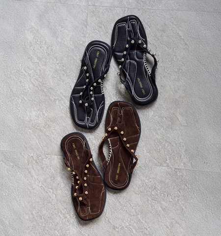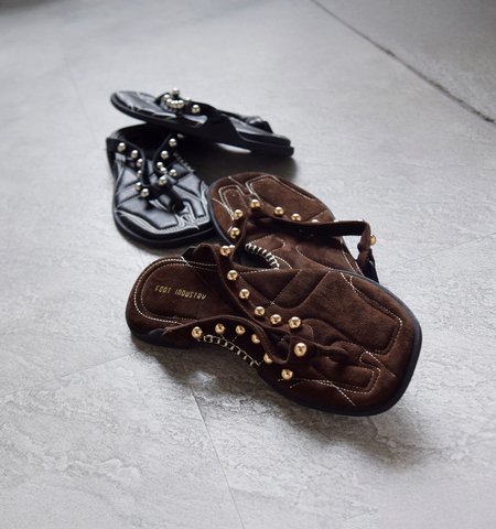 FOOT INDUSTRY(フットインダストリー)よりレザー ビジュー トング サンダルのご紹介です。上質なレザーを贅沢に使用し、足元に程よい存在感を添えるトングタイプのサンダル。アッパーにはビジューをあしらい、ラフになりがちなサンダルスタイルに、さりげない華やかさとモードなムードをプラス。レザーのキルティング調デザインが、奥行きのある表情を生み出しています。カジュアルにも、きれいめにも取り入れやすく、シンプルな装いを一段格上げしてくれる一足です。