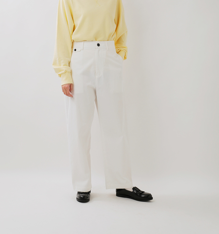 ノープリーツのウエストデザインが端正な印象で、メンズライクな風貌です。ウエスト右側にミニフラップポケットが配置されており、アクセントになっています。