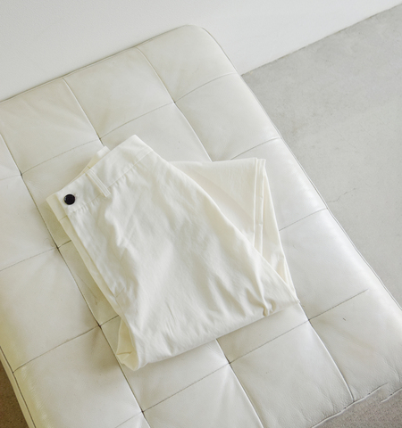 光沢感があり、なめらかでしっとりとした風合いが特徴のツイル素材。高密度に織り上げ、洗いざらしの加工を施しふくらみをあたえたこだわりのチノクロスは上質感があり、日常にリュクスな雰囲気を添えてくれます。