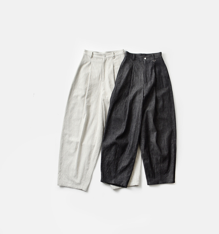 ナチュラルな素材感と、構築的なコクーンシルエットが共存した雰囲気のパンツです。リラックス感がありながらも、タックやダーツによる立体的な設計により、ラフになりすぎない印象に仕上がっています。