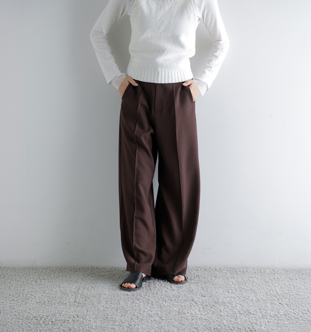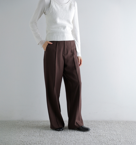 全体はワイドシルエットで、フロントのピンタックによって縦のラインが際立つ設計。ベーシックなトップスと合わせやすく、季節を問わず通年で活躍する一本です。