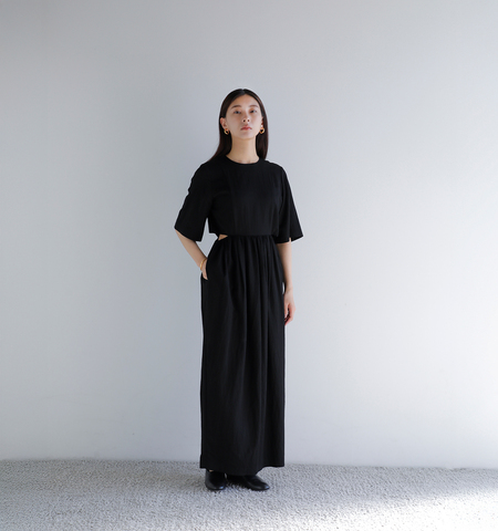 広がりすぎないスカートラインと、ウエストギャザーによる自然な立体感で構成された、落ち着きのある大人らしいコクーンシルエットです。