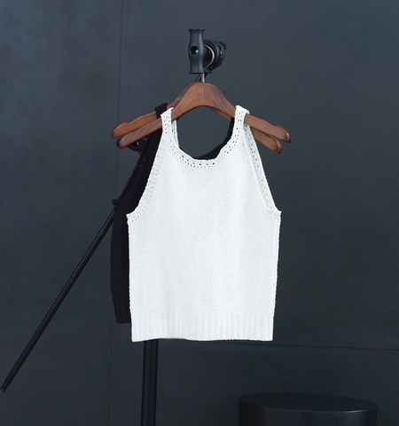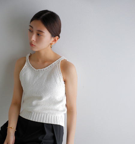 繊細な編み模様が印象的なサマーニットタンクトップ。襟ぐりからアームホールにかけての透かし編みが、軽やかな抜け感をプラス。
