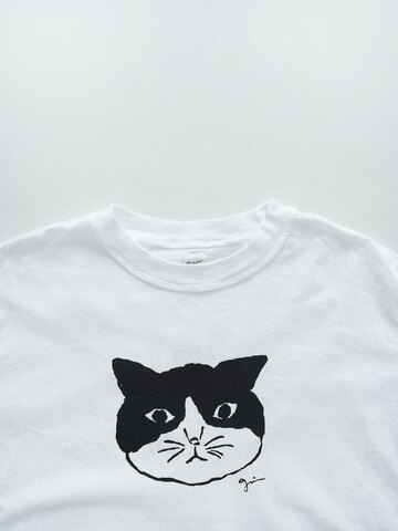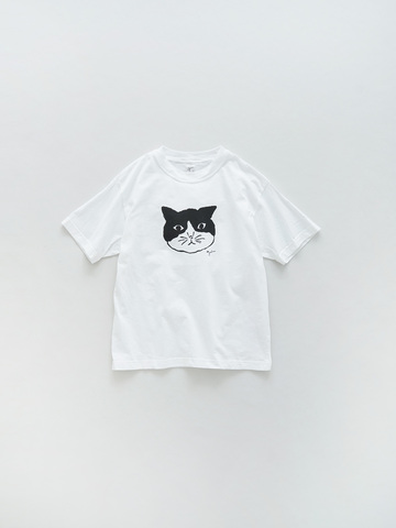 一枚ではもちろん、カーディガンやシャツのインナーとしても着まわせる半袖Tシャツ。フロントには、ふくふくとした顔のハチワレ模様のネコちゃんをプリントしました。単色プリントなので、アニマルTシャツも子供っぽくならず、大人カジュアルな着こなしに◎