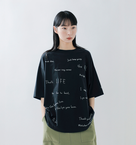 REMI RELIEF(レミレリーフ)より、SP加工 天竺コットン 刺繍 Tシャツのご紹介です。ヴィンテージライクな風合いが魅力のSP加工を施した天竺コットン素材を使用し、着始めから肌になじむ柔らかな着心地を実現。全体に、手書きのようなタッチでメッセージ刺繍を散りばめ、存在感のある一枚に仕上げられています。ユニセックスで着れるゆったりとしたシルエットと程よい落ち感が、力の抜けた大人のカジュアルスタイルを演出。デニムやイージーパンツと合わせるだけで、こなれた雰囲気を楽しめるTシャツです。