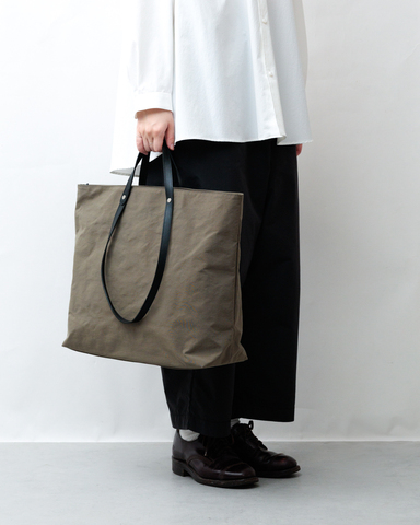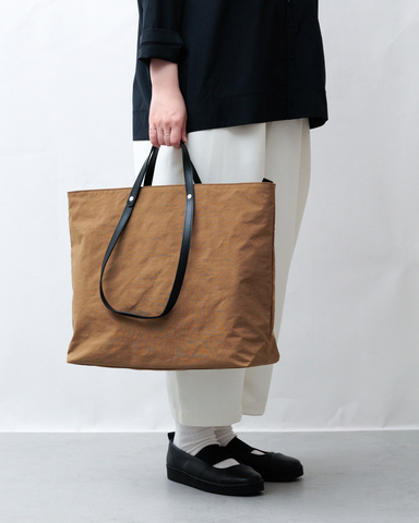 和紙のような独特のシワ感のあるナイロン、革らしい味わいと上品な印象が感じられる持ち手。