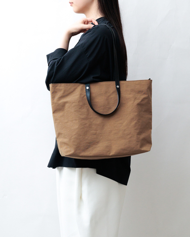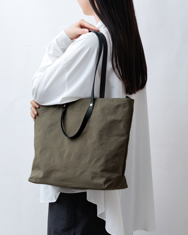 和紙のような独特のシワ感のあるナイロン、革らしい味わいと上品な印象が感じられる持ち手。