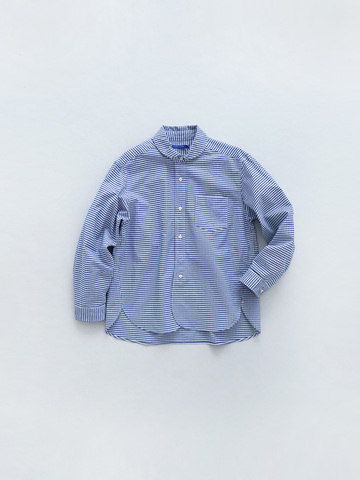 衿元を留めるためのチンストラップや、プルオーバーのようなデザインの前立てと、ワークシャツのディテールを用いたデイリーコーデにも馴染むデザイン。メンズライクな雰囲気がありつつ、丸襟や裾のラウンドカットで柔らかさをプラスしています。