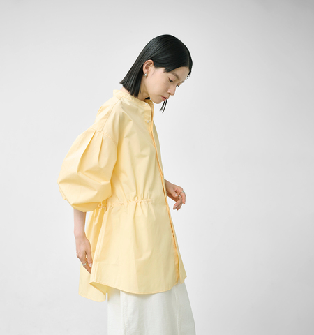 ウエスト内側のスピンドルでシルエットのアレンジをお楽しみいただけます。ギャザーをたっぷりと入れた袖口はシャーリング仕様で、袖まくりでボリューム感を演出出来ます。