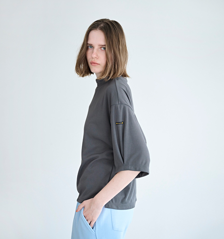 少し長めにとったハーフスリーブ、程よくコンパクトな着丈のバランスは一枚でも着用しやすいアイテムです。