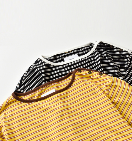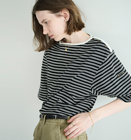 kha:ki(カーキ)より、コットンマルチボーダー ボートネック ハーフスリーブ カットソー “MULTI STRIPED TOP”をご紹介します。レトロムード漂うマルチボーダー柄が目を惹く、ボートネックのハーフスリーブカットソー。コットン素材ならではのやさしい肌触りで、デイリーに気負わず着用いただけます。首元はデコルテをきれいに見せるボートネック仕様で、女性らしい抜け感を演出。一枚で着映えし、デニムやワイドパンツ、スカートまで幅広く合わせやすい、大人カジュアルにちょうどいいボーダートップスです。