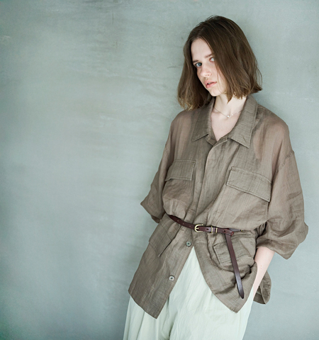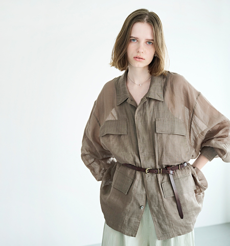 ミリタリー由来の無骨なディテールを、繊細な透け感のあるラミー素材で包み込み、季節感のある軽やかな表情に仕上がった一着。