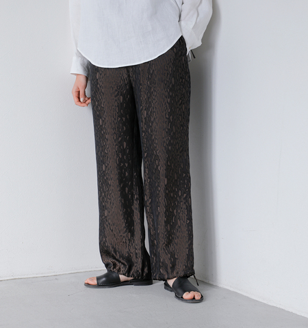 上品なレオパード柄と光沢のあるジャガード生地が大人の遊び心を演出する一枚。程よくゆとりのあるストレートシルエットで体型をカバーしつつ、動きやすく快適。ウエストは総ゴム+ドローコードで着脱も調整もラクラク。