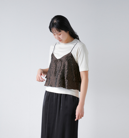 キュプラ混の生地を使用し、滑らかな光沢感と軽やかな着心地を実現。肌触りもよく、長時間でも快適に過ごせる一枚。落ち着いたトーンのレオパード柄を採用。上品に映えるレオパード柄。光の角度で表情が変わる織り柄が、コーディネートに華やかさを添えます。派手すぎず、コーディネートのアクセントとしてさりげなく存在感を発揮します。