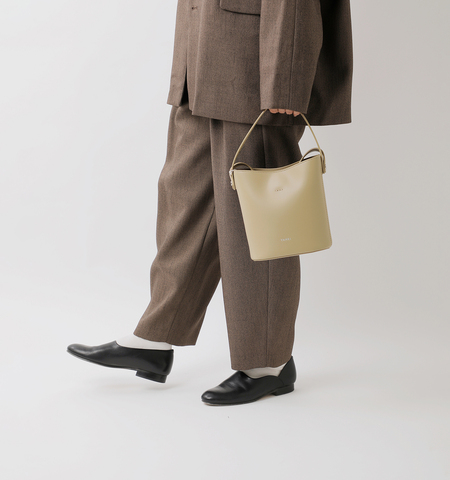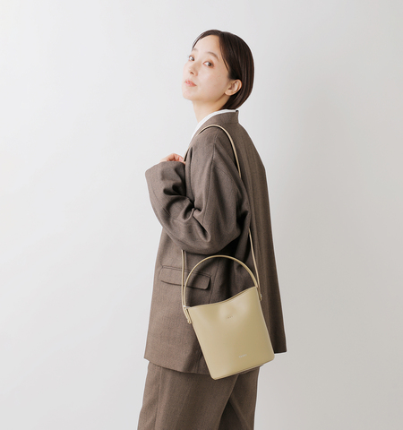 YAHKI(ヤーキ)より、フェイクレザー クロスボディバッグ をご紹介します。フェイクレザーのクロスボディバッグ。さらりとした手触りと、わずかに艶を感じる素材です。シンプルな楕円バケツシルエットをベースした普遍的な使いやすさが特徴。使わないときにはハンドルを下に倒せるデザインで、佇まいに自然な抜け感と柔らかさを生み出します。ショルダーストラップ付きで、肩掛けやクロスボディなどスタイルに合わせた持ち方が可能。開口部が広く、中身の出し入れもスムーズです。内部は開放感のあるシンプルな構造で、財布やスマートフォン、日常の必需品がすっきり収まるサイズ感。軽量で持ち運びやすく、自立するバケツ型は人気の高いアイテムです。