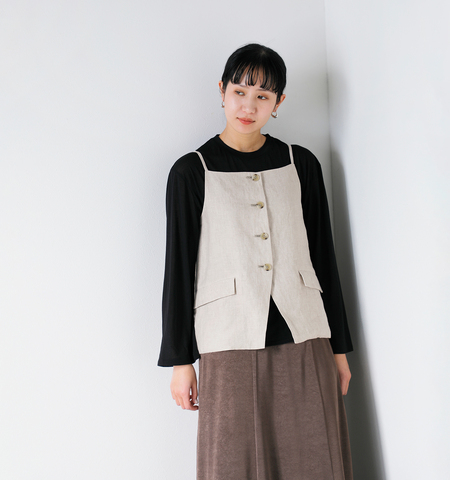上質なリネン素材を使用した、軽やかで洗練された印象のキャミソール型ベスト。ナチュラルな風合いと程よいハリ感があり、シンプルながらも存在感のある一枚に仕上がっています。