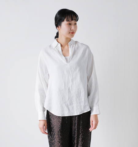 首元はすっきりとしたスキッパーデザインで、顔まわりをシャープに見せつつ、程よい抜け感をプラス。肩まわりから身幅にかけてはゆとりを持たせ、リラックス感のあるシルエットに仕上げています。前後差のある着丈で、アウトスタイルでもバランスよく決まり、ワイドパンツやスカートとも好相性。シンプルながら素材の良さが際立ち、デイリーからきれいめカジュアルまで幅広く活躍するシャツです。