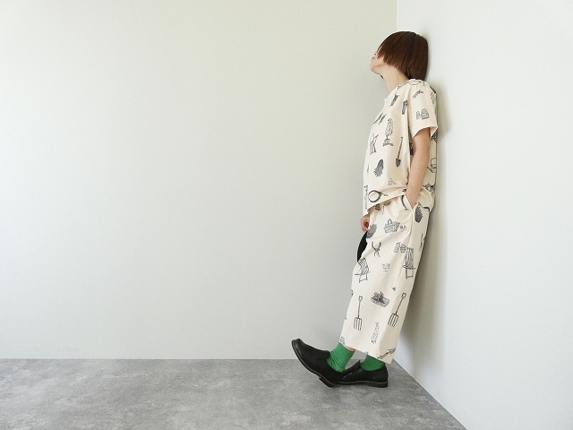 スコップやハサミやクワ、ジョウロやホースやバケツなどの園芸グッズや、長靴や麦わら帽子、お花や野菜が入ったバスケットやストライプのイスや、ウサギや犬たちが繊細に描かれています。ジョウロには「R&D.M」のロゴが入っていたり、手袋を加えて走る犬や、きょとんとした表情のウサギ。バケツに頭を突っ込んでいる子もいます。どのイラストも、ひとつひとつがなんともかわいくて心がほっこりするようなイラストたちです。かわいいと癒しがたくさん詰まった「GREAT GREEN THUMB」柄です。