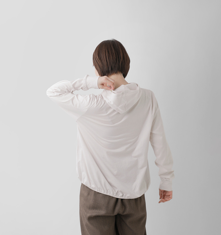 インナーとしても1枚でも着用しやすいフード付きカットソー。前後差を付けたデザインでバックがコクーン型の動きのあるシルエットを表現。