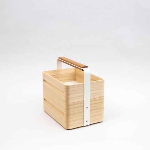 オカモチの基本のセットは、ハンドル付の深箱+浅箱の2段の組み合わせ。「正方形」「長方形」、その両方を合わせた「ミックス」の3タイプがあります。