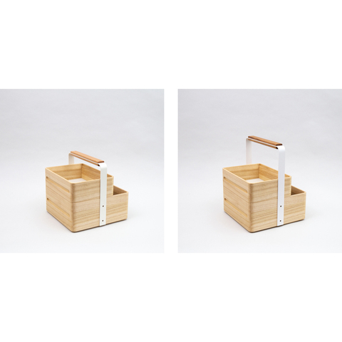オカモチの基本のセットは、ハンドル付の深箱+浅箱の2段の組み合わせ。「正方形」「長方形」、その両方を合わせた「ミックス」の3タイプがあります。