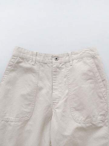 フロントにはヴィンテージの雰囲気漂う"ドーナツボタン"を採用。トップスをinした時にアクセントになってくれます。サイドの大き目のポケットやステッチ使いも、デザインポイントになっています。
