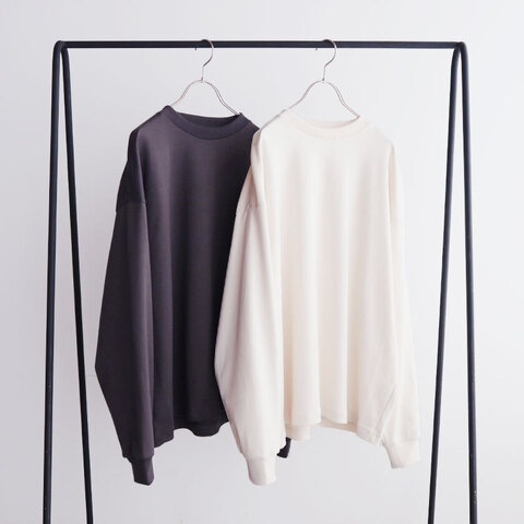 素材は独自の紡績技術で太く仕上げた糸を限界まで度詰めに編み上げたオリジナルテキスタイルを使用。ほどよいハリとコシを持つ生地に特殊加工を施すことで、綿本来の良さを最大限まで引き出し、カシミヤのようなしっとりと滑らかな風合いと美しい光沢を表現しています。やや肉厚の生地感ながらも独特の落ち感があるのも魅力の一つです。