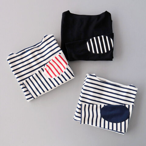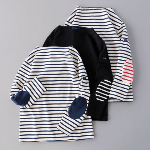 肘下のエルボーパッチはカラーによって柄やカラーが異なるデザイン。装いにほんのり個性をプラスしつつ、摩耗しやすい肘部分を補強するという機能性も兼ね備えています。デコルテをすっきり綺麗に見せてくれるボートネックや左袖のブランドタグなどバスクシャツらしいディテールはそのままに、よりカジュアルな仕上がりになっています。