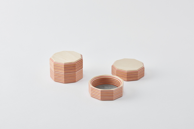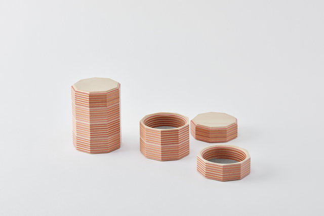 スタッキングできる設計となっており、2個、3個、そしてふた…と積み重ねていくと「Paper-Wood」の断面の美しさを堪能できるタワーとなります。