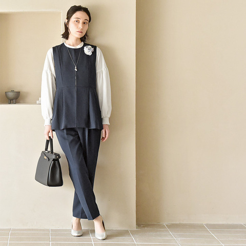 きちんと感のあるテーパードパンツは、フォーマルな装いにも、普段のお仕事コーデにも大活躍。同じ素材を使った「ウエスト切替 ペプラムジレ」とセットアップできるので、きちんと感が大切なハレの日コーデにもぴったりです。