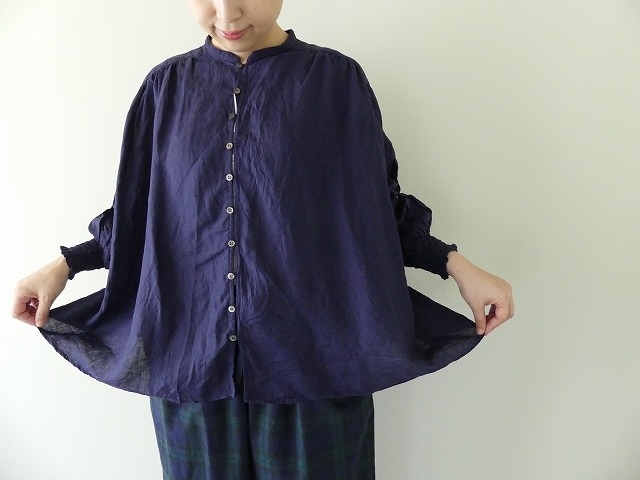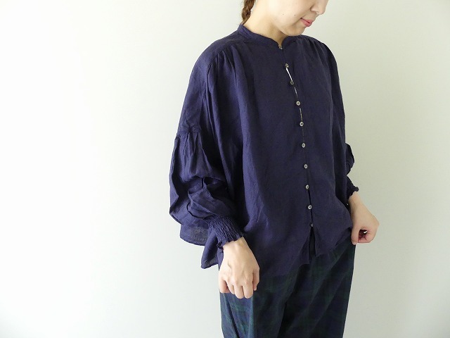 リネンの風合いが素敵なブラウス。少し立ち上がったノーカラーの衿が、大人っぽいデザインです。背中にはギャザーが施されていて、後ろ姿はふんわりと柔らかな印象に仕上げています。