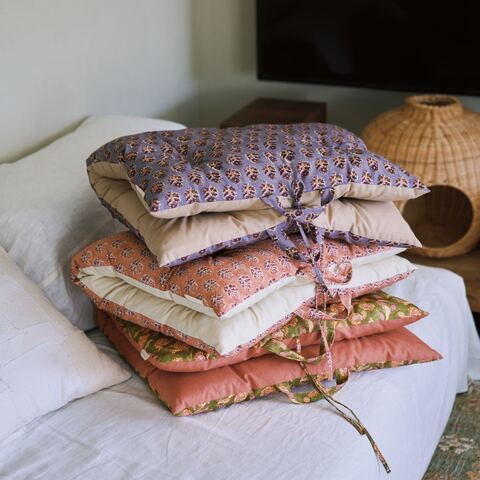 ブロックプリントのニュアンスを再現した、表情豊かな生地。華やかさとナチュラルが同居する、お部屋に合わせやすい色を選びました。