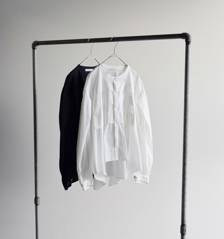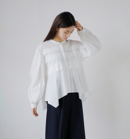太めのピンタックと裾のレギュラーヘムがポイントのフレアシャツ。 前立てのすっきりしたディテールと裾に広がるドレープ感が上品な華やかさをプラスします。