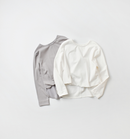 ザラっとした表面感のある生地は、しっかりとしたストレッチ素材で程よく身体にフィットし、着心地の良さも魅力。タックによってフロントのみボトムにタックインしているように見えるため、コーディネートが簡単に決まります。着丈には前後差があり、バックスタイルはヒップが隠れる安心感のあるデザイン。通常のカットソーを実際にタックインするよりもウエストまわりをふんわりカバーでき、タックインが苦手な方にもおすすめしたい一枚です。
