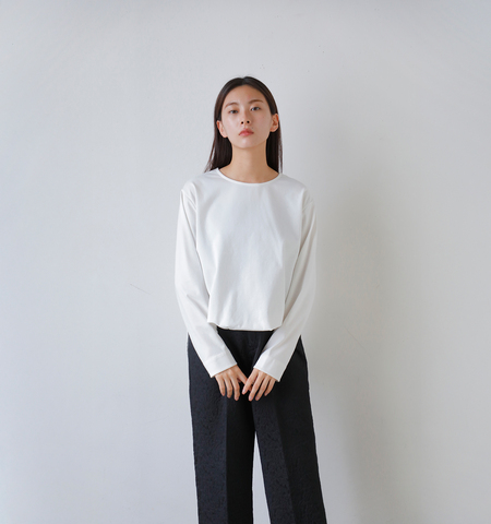 フロント裾にタックを施し、折り曲げてふんわりとさせたデザインが印象的なプルオーバーです。前裾をかなり短く設定することで、インしなくても自然とバランス良く見える丈感に仕上げています。