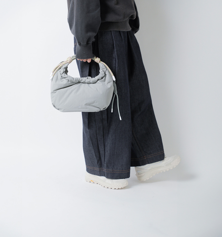軽量で耐久性に優れたナイロン素材を使用。ナイロン特有のハリ感を活かしつつ、不規則なシワ加工を施すことで、紙のようなドライな質感と奥行きのある表情を生み出しています。シワが目立ちにくく、デイリー使いでも扱いやすいのも魅力。さらに弱撥水加工を施し、急な天候の変化にも対応する実用性を備えています。