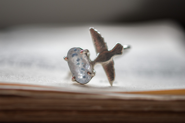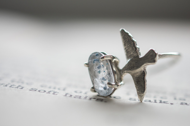 北の神話では、知恵と導きの象徴として語り継がれ、 道に迷った旅人を正しい方角へ導いた鳥だといわれています。 この指環に佇むワタリガラスは、 静かな湖面を見下ろすように、 澄んだアクアマリンの上へそっと身を寄せています。 冷たい風。 清らかな水。 遠くへ続く空の気配。 身につけるたび、 心が少し広い世界へひらいていくようなリングです。