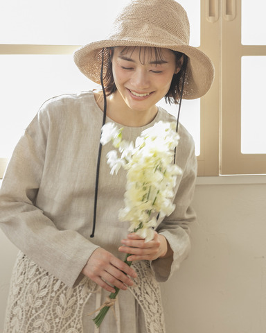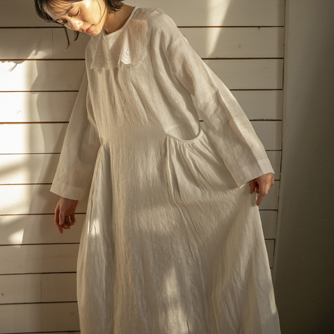 同シリーズのローブコートやパンツは、同じリネン素材を使用しているため、セットアップでの着こなしも楽しめます。さらに、コットンレースラップスカートやつけ襟を重ねたレイヤードスタイルもおすすめ。季節や気分に合わせて、さまざまな表情を楽しめるワンピースです。